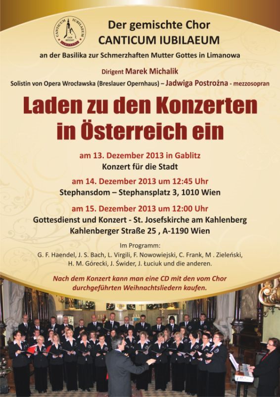 W dniach od 13 - 15 grudnia br. Chór Mieszany CANTICUM IUBILAEUM będzie koncertował w Austrii. Zespół wystąpi w piątek 13 grudnia z koncertem dla mieszkańców Gablitz. W sobotę 14 grudnia koncertować będzie w wyjątkowym miejscu, jakim jest Katedra Świętego Szczepana w Wiedniu. W niedzielę 15 grudnia Chór CANTICUM IUBILAEUM został zaproszony na Kahlenberg, gdzie o godzinie 12:00 uświetni swym śpiewem Mszę Świętą, a po niej wykona koncert. Chórowi towarzyszyć będzie solistka Jadwiga Postrożna. Chór będzie promował Ziemię Limanowską poprzez wykonywaną muzykę chóralną, a także polskie, tradycyjne kolędy.