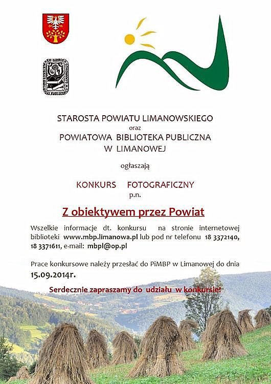Limanowska Powiatowa i Miejska Biblioteka Publiczna ogłosiła tegoroczną edycję konkursu fotograficznego „Z obiektywem przez Powiat”. Wierzymy, że podobnie jak w latach ubiegłych, również w tym roku konkurs spotka się z dużym zainteresowaniem. Na terenie naszego Powiatu mamy wielu bardzo zdolnych fotografów oraz całe multum miejsc i obiektów, które mogą służyć za tematyczną materię prac konkursowych. Zapraszamy do udziału.