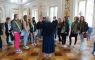 O godzinie 6 rano, po zebraniu wszystkich uczestników wyruszyliśmy w trasę – relacjonują uczestnicy wycieczki. Pierwszym punktem naszej podróży był Pałac w Wilanowie z lekcją muzealną. Przewodnik w bardzo ciekaw i, interesujący sposób opowiedział o historii tego miejsca. Uczniowie na pamiątkę otrzymali karty pracy „Wnętrza pałacu i ich symbolika”.
