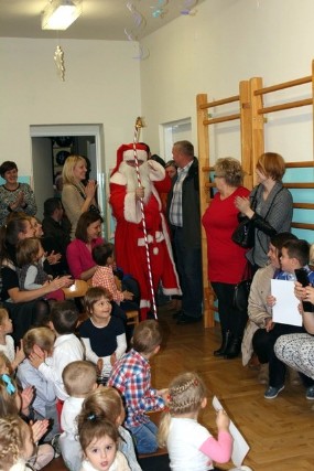 Tego samego dnia, wychowanków przedszkola odwiedził, tak bardzo oczekiwany przez cały rok, szczególny Gość - Święty Mikołaj wraz z dwoma wesołymi elfami. Nasze maluchy pięknie powitały Mikołaja; recytowały wiersze zaśpiewały kolędę „Gore gwiazda" oraz zatańczyły układ choreograficzny do piosenki E. Preslya „Jailhouse rock”, do którego chętnie dołączył się „Przybysz" z dalekiej krainy - dodają przedszkolanki. Spotkanie upłynęło w miłej atmosferze oraz na serdecznej rozmowie. Każdy maluch otrzymał prezent, mógł podejść do Mikołaja i zrobić sobie z Nim pamiątkowe zdjęcie.