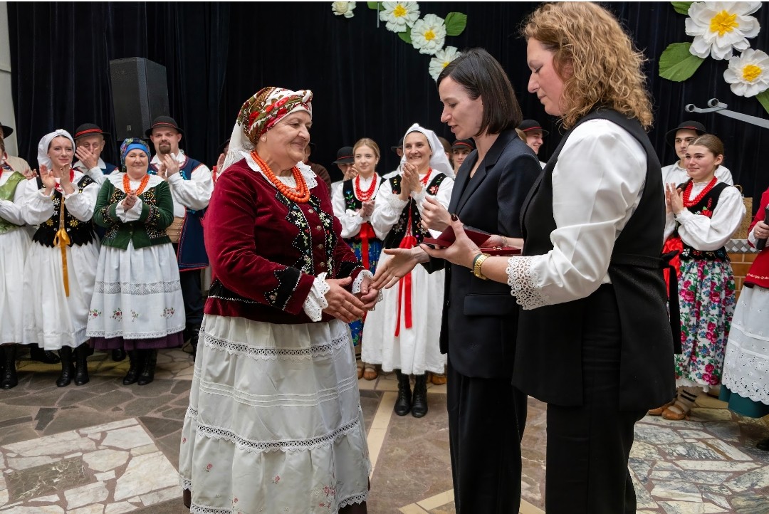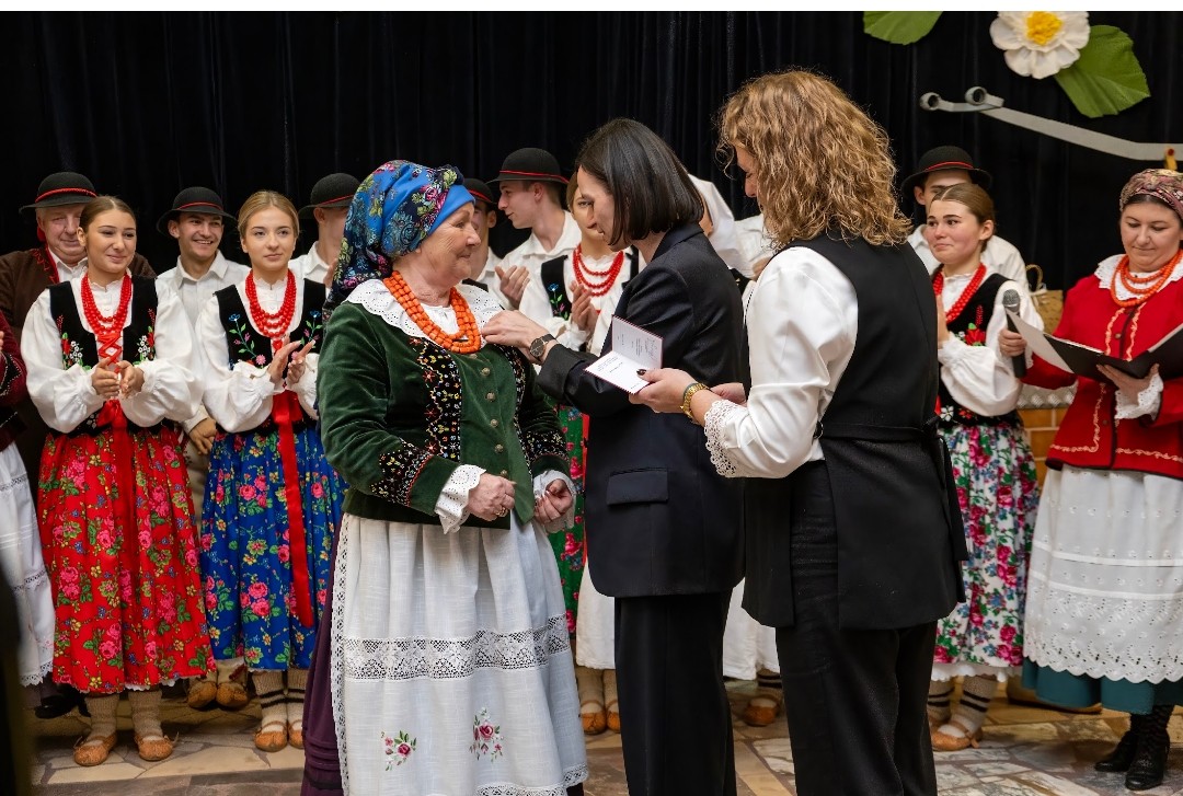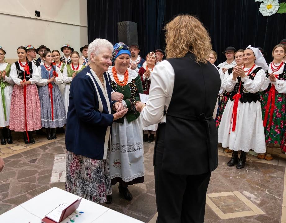 Wielka Dama Folkloru Lachów Limanowskich - niezrównana strażniczka tradycji, artystka serca i ducha, legenda sceny ludowej od ponad półwiecza! Z folklorem Lachów Limanowskich związana od 1969 roku - od chwili, gdy po raz pierwszy stanęła na scenie jako tancerka Zespołu Pieśni i Tańca „Limanowianie”, aż po dziś dzień, nieprzerwanie służy kulturze i dziedzictwu swojego regionu z pasją, oddaniem i niezłomną determinacją. Jej wkład w pielęgnowanie, dokumentowanie i rozpowszechnianie tradycji Lachów nie ma sobie równych - zarówno pod względem artystycznym, jak i edukacyjnym. Jako solistka - olśniewała sceniczną charyzmą. Jako instrumentalistka – z pasją wydobywała archaiczne brzmienia z burcoka, dzwonków tonacyjnych pasterskich, sprawiając, że ginące dźwięki lachowskiej wsi rozbrzmiewały na największych scenach świata. W jej wykonaniu melodie Lachów trafiły na anteny Polskiego Radia, stając się bezcennym świadectwem autentycznego folkloru. Nie tylko godnie reprezentowała Ziemię Limanowską na niezliczonych scenach w całej Polsce – była ambasadorką polskiej kultury ludowej za granicą: w 1974 r- Węgry na Międzynarodowym Festiwalem Folklorystycznym -zespół otrzymał ,,Złotego Pawia”, 1975 r,- Hamburg, - udział w obchodach ,,25-lecia Związku Polaków – ZGODA” , 1976r,. – Szwecja – Dni Polskie, 1996r. -Dania – Dni Polskie, 1977r, - Niemcy ,,Dni Polskie”, 1978 r. – Czechosłowacja- Międzynarodowy Festiwal Folklorystyczny w Myjave, 1979 r. – Francja – Udział w Światowym Festiwalu NOEL- w Nancy 1979 r,- Niemcy – Występ dla grupy Polskiej w Finsterwalde, 1988 r – Niemcy- Wyjazd Zespołu na ,,Dni Polskie” do Todtmoss, 1989 r. , Ukraina wyjazd Zespołu na zaproszenie zespołu Karpaty,1993 r. – Włochy- Wymiana kulturalna z miastem Camporgiano , 1994r., - Holandia- wymiana kulturalna w Terheijden, 1994 r- Niemcy – Wyjazd zespołu na Międzynarodowe Targi Turystyczne w Berlinie, 1996 r,- Niemcy występ w ramach Wymiany Kulturalnej, 1999r., -Chiny-Światowy Festiwal Folklorystyczny w Pekinie, 2000r., - Chorwacja- Międzynarodowy Festiwal Zespołów Folklorystycznych w w Monastir, 2000 r- Miedzy na rodowy Festiwal Muzyczny , Światowa wystawa EXPO- 2000 w Hanowrze, 2003r,- Na zaproszenie Polskiej misji Katolickiej w Norymberdze 2006 r- Niemcy – uroczystości związane z urodzajem plonów, 2006r,- Słowacja- Występ Zespołu dla mieszkańców Dolnego Kubina, a nawet w Kuwejwcie 1990 r. – Dni Kultury Polskiej, Światowa Wystawa EXPO -90 Niosła ze sobą dźwięk polskiej pieśni, kolor tradycyjnego stroju i ducha lachowskiej dumy. To właśnie ona – jako znawczyni folkloru, choreografii i gwary – szkoliła artystów legendarnego „Mazowsza”, by mogli włączyć do swego repertuaru żywy folklor Lachów Limanowskich. Jest nauczycielką, mistrzynią i przewodniczką wielu pokoleń młodych tancerzy i muzyków. Niezmiennie wpajała szacunek do stroju, do melodii przodków i do sceny, na której każdy występ był dla niej świętem. Autorka i współautorka wielu widowisk scenicznych, z których niejeden został nagrodzony – jak choćby Srebrna Ciupaga zdobyta w 1994 roku na prestiżowym Międzynarodowym Festiwalu Folkloru Ziem Górskich w Zakopanem. Pod jej okiem powstawały niezliczone płyty, kasety, scenariusze, stroje i dekoracje. Wszechstronna i niezastąpiona – była sercem i duszą zespołu, prawą ręką śp. Ludwika Mordarskiego. Wspierała organizację, dbała o dyscyplinę i motywację młodzieży, była mentorką i opiekunką, oddaną zespołowi aż do 2016 roku. Uhonorowana licznymi odznaczeniami, m.in. „Za zasługi dla Województwa Nowosądeckiego” oraz „Za zasługi dla Miasta i Gminy”, nie spoczęła na laurach. W 2020 roku wkroczyła w szeregi nowo powstałego Zespołu Regionalnego „Starowiejski HYR” w Starej Wsi, gdzie do dziś jest nie tylko aktywną członkinią, lecz także nieocenionym filarem organizacyjnym i artystycznym. Wspiera kierownictwo zespołu, pomaga w działaniach promujących region, dzieli się bezcennym doświadczeniem i niezłomną energią. Wiedza, którą zgromadziła przez dziesięciolecia pracy z zespołem „Limanowianie”, wykraczała daleko poza granice regionu. Krystyna Mól ma niezwykły dar nauczania – nie tylko techniki tańca, ale też jego duszy, kontekstu i znaczenia. Jej umiejętności docenił również renomowany Zespół Pieśni i Tańca „Mazowsze”, który zwrócił się do niej o wsparcie w nauce tańców Lachów Limanowskich. To właśnie dzięki niej Lachowski repertuar zagościł na stałe w programie „Mazowsza” i jest prezentowany przed publicznością do dziś. Jej nauka była nie tylko precyzyjna i profesjonalna, ale też pełna pasji – uczyła z serca, wprowadzając artystów w klimat, rytm i symbolikę każdego kroku. Szczególnym aspektem jej działalności była również edukacja w zakresie gry na dzwonkach pasterskich – instrumentach prostych, lecz głęboko zakorzenionych w tradycji Lachów Limanowskich. Krystyna potrafi wydobywać z nich dźwięki, które oddawały klimat beskidzkiej wsi, a jej uczniowie szybko odkrywali, że za każdą melodią kryje się opowieść o życiu, pracy i duchowości przodków. Dzięki takim działaniom stała się nie tylko twórczynią kultury, ale jej żywym przekazem – pomostem między historią a współczesnością, między lokalnością a narodowym dziedzictwem. W latach 2022, 2023 , 2025 Zespół Starowiejski HYR pokazywał widowiska historyczne z 1935 r. pt. ,,Jako my się uciesyli z łodwiedzin Biskupa’’ i obrzędowe z przełomu XIX/ XX w. pt. ,,Po chrzinach ‘’ i ,,Imioniny u Jona’’ to właśnie Pani Krystyna odegrała szczególną rolę w układania i pisania scenariuszy do tych widowisk dzięki czemu Zespół odniósł ogromne uznanie w konkursach takich jak ,,Limanowska Słaza” w Limanowej zajęcie za każdym razem I miejsca i nominacja do Ł