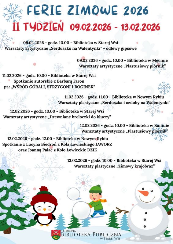 12 lutego o godz. 10.00 w Bibliotece w Starej Wsi dzieci wezmą udział w warsztatach artystycznych „Drewniane breloczki do kluczy”, a równolegle w Bibliotece w Kaninie ponownie odbędą się warsztaty „Plastusiowy piórnik”. O godz. 12.00 w Bibliotece w Nowym Rybiu zaplanowano spotkanie z Lucyną Biedroń z Koła Łowieckiego „Jaworz” oraz Joanną Palac z Koła Łowieckiego „Dzik”. Zwieńczeniem ferii będą warsztaty plastyczne „Zimowy krajobraz”, które odbędą się 13 lutego o godz. 10.00 w Bibliotece w Starej Wsi.