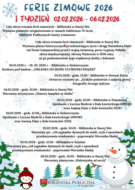 Przez cały okres trwania ferii zimowych w Bibliotece w Starej Wsi dostępna będzie wystawa plakatów zorganizowana w ramach Jubileuszu 70-lecia Bibliotek Publicznych Gminy Limanowa. Równocześnie prezentowana będzie wystawa plansz historycznych poświęcona życiu i drodze Stanisława Mąki – od Ziemi Limanowskiej sprzed I wojny światowej, przez Legiony Polskie, okres międzywojenny i obronę Wybrzeża w 1939 roku, aż po podsumowanie jego wojskowej służby i dokonań. Z kolei w Bibliotece w Siekierczynie w dniach od 30 stycznia do 28 lutego, odbędzie się konkurs plastyczny pod hasłem „Okładka do mojej ulubionej książki”.
