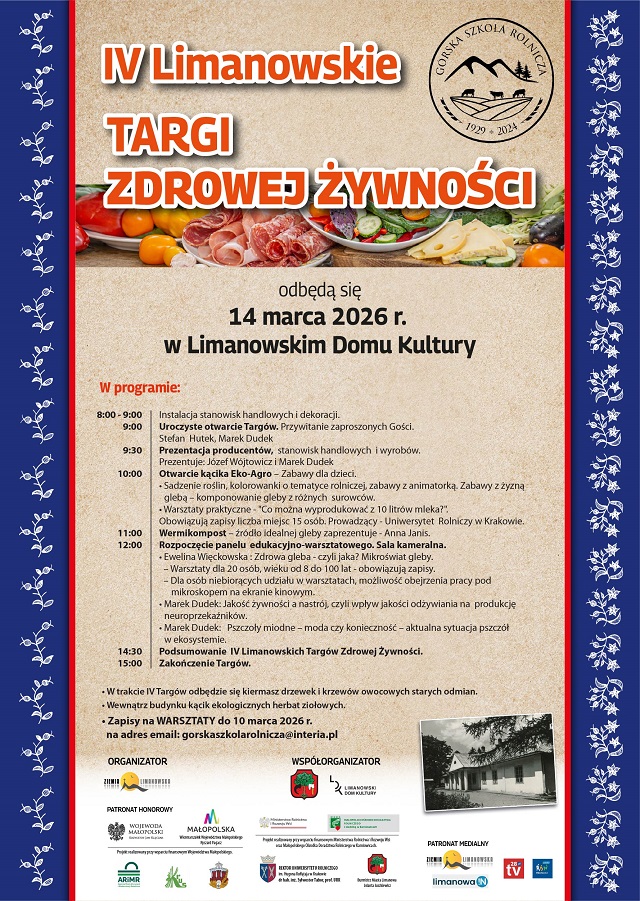 Już 14 marca 2026 r. odbędą się 4 Limanowskie Targi Zdrowej Żywności. Jak bywało w latach ubiegłych wystawcy producenci zdrowej żywności zapraszają do przedświątecznych zakupów produktów wysokiej jakości wytwarzanych tradycyjnymi metodami. Będą producenci serów, wyrobów masarskich, pieczywa, napojów, soków, ziół, kosmetyków ekologicznych i wiele innych. Planowane są imprezy towarzyszące, miedzy innymi warsztaty przetwórstwa mleka w warunkach gospodarstwa domowego czyli . „Co można wyprodukować z 10 litrów mleka?” Zajęcia poprowadzi kadra naukowa Uniwersytetu Rolniczego w Krakowie: dr Agnieszka Pluta, prof. Jacek Domagała, prof. Marek Sady. Obowiązuje limit osób uczestników w ilości 15. Odbędą się również warsztaty dla dzieci ”Zdrowa gleba czyli jaka? Prowadzi Ewelina Wieckowska . Obowiązują również zapisy liczba miejsc jest ograniczona. Będzie dostępna sprzedaż starych odmian drzew owocowych wszystkich gatunków. Patronatem Honorowym Targi objęły następujące osoby i instytucje: Minister Rolnictwa i Rozwoju Wsi, Rektor Uniwersytetu Rolniczego w Krakowie, Marszałek Województwa Małopolskiego, Wojewoda Małopolski, Dyrektor MODR w Karniowicach, Izba Rolnicza w Krakowie, ARMiR Limanowa, KRUS Limanowa. Poseł na Sejm RB Urszula Nowogórska, Burmistrz Miasta Limanowa Jolanta Juszkiewicz. Organizatorem Targów jest Stowarzyszenie Kulturalno-Oświatowe Ziemia Limanowska a współorganizatorem Limanowski Dom Kultury. Znakiem towarowym zarejestrowanym na terenie UE pod którym odbywają się Targi jest Górska Szkoła Rolnicza jako gwarancja jakości żywności o pomad 100 letniej tradycji. Od tego roku zapraszamy na całoroczny Targ Limanowski dostępny na stronie internetowej Ziemia Limanowska.