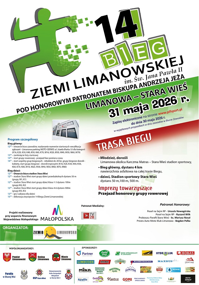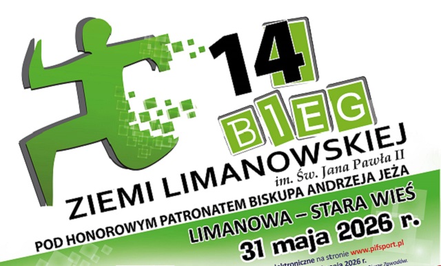 Bieg Ziemi Limanowskiej im św. Jana Pawła II już po raz 14 odbędzie się w niedzielę 31 maja 2026 r. Główny bieg odbędzie się na trasie Limanowa –Stara Wieś na dystansie 4 km. Na stadionie sportowym w Starej Wsi odbędą się dystanse biegowe dla dzieci. Imprezą towarzyszącą będzie rodzinny przejazd rowerowy na trasie Limanowa - Stara Wieś, poprzedzający start zawodników. Szczegółowe informacje udostępnione są TUTAJ w Regulaminie 14 Biegu Ziemi Limanowskiej. Zapisy elektroniczne możliwe są na stronie Pif Sport https://pifsport.com.pl/xiv-bieg-ziemi-limanowskiej-im-sw-jana-pawla-ii-limanowa-stara-wies-31-05-2026r-godz-14-15/. Organizatorzy zapewniają plac rekreacji i zabawy dla dzieci pod opieką zawodowych animatorów. Serdecznie zapraszamy.